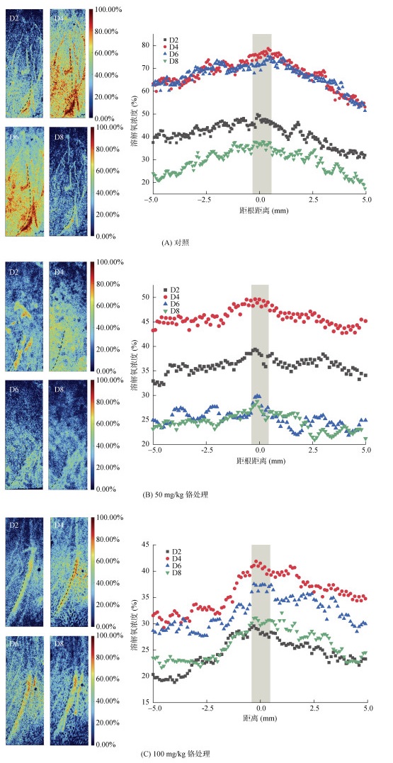3 讨论根际是土壤中受植物根系活动影响最为强烈的微域环境,是植物–微生物–土壤相互作用的主要界面[20]。研究表明,植物根系泌氧能通过改变氧化还原电位、调控根际微生物活动等方式改变根际重金属形态和生物有效性,从而影响植物对重金属的吸收[21]。本研究利用平面光极技术提供了铬处理下超富集植物李氏禾根际溶解氧的时空变化情况,为揭示植物修复的根际效应和作用机理提供了科学依据,对丰富植物修复基础理论有着重要的科学意义。