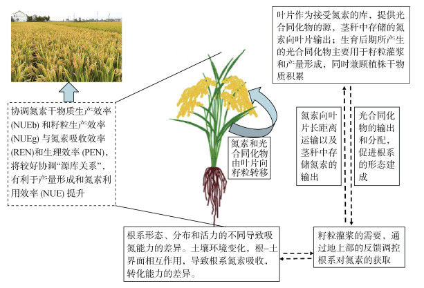 有关水稻氮素利用效率基因型差异研究的持续深入,是实际生产中氮素养分管理和氮高效品种培育的重要指引。在主要稻作区,高氮投入导致氮素利用效率不高的主要原因在于植株体内的冗余氮素不能被及时同化利用,影响植株根系生理特征对土壤氮素状况的响应,这种差异性的变化扰乱了水稻植株干物质生产与氮素生理利用过程的平衡。叶片是氮素接受和同化的主要库器官,也是光合同化物输出的源器官,根系从土壤中获取的氮素和茎秆中所存储的氮素均会向叶片输送,通过光合作用生成光合同化物,用于根系生长发育和形态建成;而在高氮投入情况下,功能叶片首先受到植株氮素环境变化的影响,不同氮效率水稻品种在这方面的体现更为明显;而功能叶高效的光合同化能力则更有利于稻株应对高氮投入时的氮素利用,尤其在灌浆阶段,协调植株的氮素干物质生产效率、籽粒生产效率与氮素吸收效率和生理效率之间的关系,将更好地协调灌浆阶段各要素间的“源库关系”,从而促进产量形成和氮素利用效率的提升(图 1)。