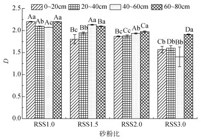 (柱图上方不同大写字母表示相同土层不同砂粉比土壤间差异显著(P < 0.05),而不同小写字母表示相同砂粉比土壤不同土层间差异显著(P < 0.05),样本数n=3) 图 3 不同砂粉比土壤单重分形维数 Fig. 3 Single fractal dimensions of soils with different radios of sands/silts |