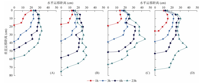不同土层湿润锋运移速率的变化对湿润体的形成有较大影响。各人工林湿润锋水平和垂直运移速率均值在不同土层间均随时间变化呈下降趋势(图 7 ~ 图 8),这是由于在入渗初期,湿润距离较小,湿润锋处土壤含水率较高,湿润锋周边水势梯度较大,水吸力大,湿润锋运移速率较大;随时间推移,湿润距离逐渐增大,湿润锋处的土壤含水率却逐渐减小,其周边水势梯度相应减小,水吸力小,故湿润锋运移速率减小,这与文献[30]和[31]研究结果一致。随土层深度增加,湿润锋垂直运移速率逐渐减小但水平运移速率小幅增大,垂直运移速率减小仍与时间变化水势梯度减小有关;从湿润锋二维运移过程(图 5)来看,各土层水平运移情况受不同时刻垂直运移距离影响较大,浅土层由于在灌溉初期便出现湿润锋水平运移且随时间推移速率而不断减小,土层越深则出现水平运移越晚,则水势梯度和运移速率降幅也越小,因此土层越深则水平运移速率均值越大。