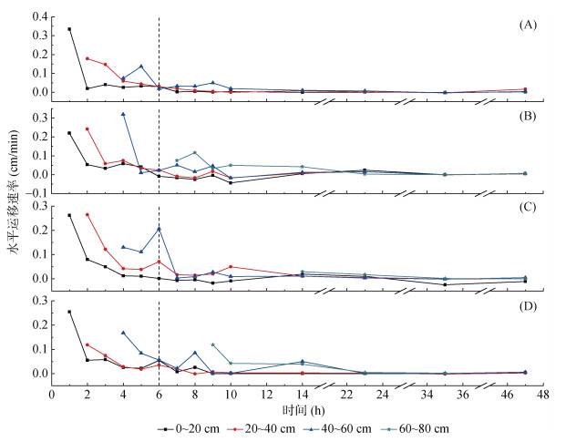 由图 7可知,灌溉时间(0 ~ 6 h)和停灌后水分再分布时间(6 ~ 47 h)内,各人工林湿润锋水平运移速率均值在不同土层间均呈现减小趋势。灌溉时间内,0 ~ 20、20 ~ 40和40 ~ 60 cm土层平均水平运移速率随土层深度增加均出现增大趋势,40 ~ 60 cm土层较0 ~ 20 cm土层增大0.011 ~ 0.080 cm/min。停灌后,水平运移速率随土层加深变化趋势与停灌前相似,但增幅减小,60 ~ 80 cm土层较0 ~ 20 cm土层增大0.006 ~ 0.047 cm/min。