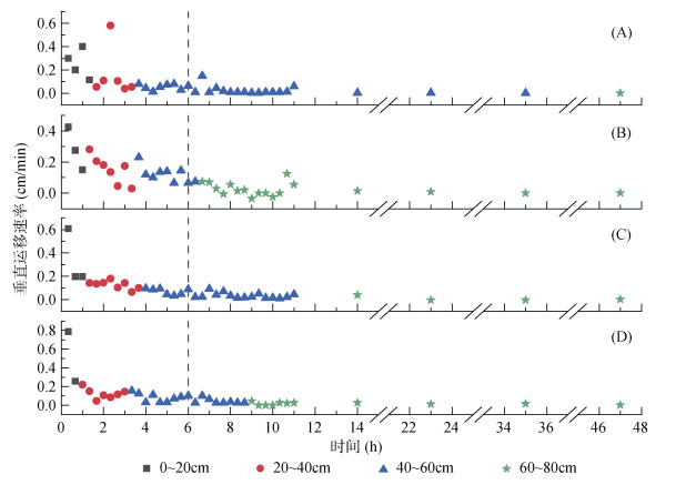 各人工林湿润锋垂直运移速率均值随时间变化及土层加深整体均呈现减小趋势(图 8)。灌溉0 ~ 6 h内,40 ~ 60 cm土层较0 ~ 20 cm土层垂直运移速率均值下降0.16 ~ 0.44 cm/min。停灌后,垂直运移速率均值随土层加深变化趋势与停灌前相似,但降幅减小,60 ~ 80 cm土层较40 ~ 60 cm土层减小0.017 ~ 0.053 cm/min。