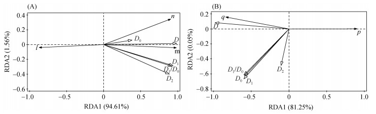 从图 9A可知,土壤分形特征共解释了96.17% 水分一维水平运移方程参数的变异,其中第一轴和第二轴解释率分别为94.61% 和1.56%。D、D1/D0和D2对方程参数解释率较大,分别为91.8%、2.6% 和1.8%;图 9B表明水分一维垂直运移方程参数81.3% 的变异可由土壤分形特征来解释,两个典型变量对方程参数变异的解释率分别为81.25% 和0.05%,D和D2对方程参数解释率较大,分别为78.1% 和2.7%。