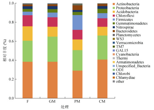 由图 5可知,在细菌门水平上的优势种群有放线菌门(Actinobacteria)、变形菌门(Proteobacteria)、酸杆菌门(Acidobacteria)、绿弯菌门(Chloroflexi)、厚壁菌门(Firmicutes),分别占土壤细菌群落的26.42% ~ 41.12%、21.41% ~ 27.69%、9.23% ~ 15.14%、8.80% ~ 11.63%、3.72% ~ 22.54%,几种优势种群共占细菌群落的85% 以上。不同处理土壤细菌门水平发生一定程度的改变,Actinobacteria相对丰度大小为CM > F > GM > PM,Proteobacteria相对丰度大小为GM > CM > F > PM,Acidobacteria相对丰度大小为F > PM > GM > CM,Chloroflexi相对丰度大小为F > PM > GM > CM,Firmicutes相对丰度大小为PM > CM > GM > F。PM处理的Firmicutes相对丰度较其他处理高,而Actinobacteria和Proteobacteria的相对丰度较低。F处理的酸杆菌门Acidobacteria和Chloroflexi相对丰度较高,而Firmicutes相对丰度较低。GM和CM处理的Actinobacteria和Proteobacteria相对丰度较高,Acidobacteria相对丰度较低。