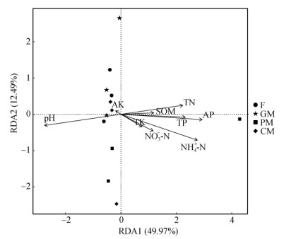 土壤蔗糖酶、脲酶、碱性磷酸酶和过氧化氢酶与土壤碳氮磷元素转换密切相关。各处理酶活性如表 4所示,不同粪肥均较F处理提高了土壤脲酶、蔗糖酶、碱性磷酸酶和过氧化氢酶活性,PM处理的脲酶和碱性磷酸酶活性分别较F处理提高了30.7% 和26.8%。不同处理间蔗糖酶活性的大小为GM > PM > CM > F,GM处理蔗糖酶活性最高,分别较F、PM和CM高150.4%、31.0% 和92.0%。CM处理过氧化氢酶活性显著高于GM和F处理,分别较F、GM和PM处理高30.1%、11.8% 和7.14%。