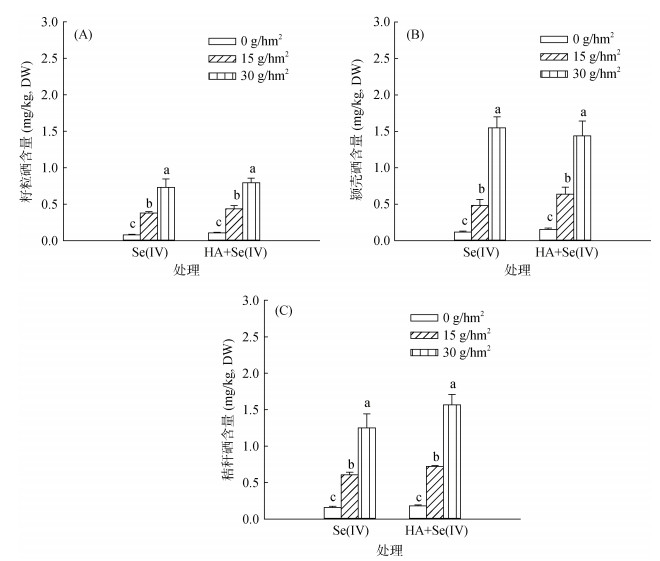 图 2 亚硒酸钠和腐植酸+亚硒酸钠处理下水稻各部位的硒含量 Fig. 2 Se contents in different rice parts treated with Se (Ⅳ) and HA+Se (Ⅳ) |