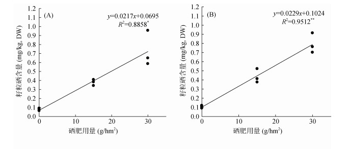 (A. 亚硒酸钠;B. 腐植酸+亚硒酸钠;*、**分别表示相关性达P < 0.05和P < 0.01显著水平) 图 3 水稻籽粒硒含量和硒肥施用量之间的相关性 Fig. 3 Correlations between Se content in rice grains and application dosage of Se fertilizers |