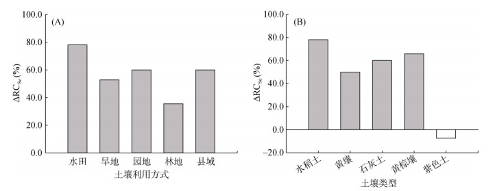 研究区土壤Se背景变化率(ΔRCSe)见图 4。由图 4可知,县域及水田、旱地、园地ΔRCSe分别为60.00%、78.12%、52.77%、60.00%,说明县域及水田、旱地与园地土壤Se地球化学背景呈显著增加趋势,林地ΔRCSe为35.55%,说明林地土壤Se地球化学背景呈增加趋势,但不显著;水稻土、黄壤、石灰土、黄棕壤与紫色土ΔRCSe分别为78.12%、50.00%、60.00%、65.79% 与–7.27%,说明水稻土、黄壤、石灰土与黄棕壤Se地球化学背景呈显著增加趋势,紫色土Se地球化学背景呈降低趋势。
