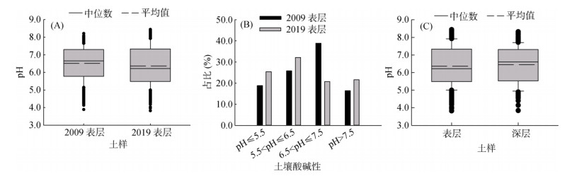 对清镇市2009年的表层土壤pH数据(1 267个)[27]与2019年的表层土壤pH数据(4 637个)进行分析,10年间表层土壤pH由6.51降低至6.36,降低0.15个单位(图 5A)。10年间中性土壤(6.5 < pH≤7.5)占比降低,降幅为18.18%;强酸性土壤(pH≤5.5)、弱酸性土壤(5.5 < pH≤6.5)与碱性土壤(pH > 7.5)占比增加,增幅分别为6.57%、6.38% 与5.23%(图 5B)。结果表明,清镇市表层土壤整体呈现酸化趋势,这与黄至颖等[28]对贵州省pH变化特征分析结果一致。2019年表层与深层土壤pH见图 5C,可见,表层与深层土壤pH均值分别为6.36与6.47,相差为0.11,说明表层土壤出现酸化现象。清镇市2010年地力评价结果显示,三等地力以上耕地占比为51.63%,仍有约48.37% 的耕地地力水平不高[27],因此,农户需要通过大量施用化肥获得高产,而过量施用化肥是导致土壤酸化的主要原因之一[29]。此外,贵州省近年来降水量与温度增加,也是造成土壤酸化的主要原因之一[28]。