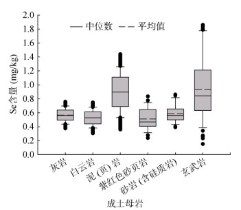 图 6 不同成土母岩发育土壤Se含量 Fig. 6 Se contents of soils derived from different parent rocks |