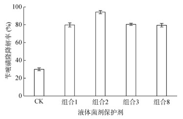 将在上述浓度筛选试验中存活提高率较高的保护剂浓度组合1、2、3和8进行苄嘧磺隆降解效果验证。如图 1,加入4种保护剂保存30 d后的S113液体菌剂对苄嘧磺隆的降解效果均高于对照组,降解率均达到80%左右,由此可见,提高活菌数可有效提高降解菌剂的降解效果。其中,组合2对苄嘧磺隆降解率最高,达94.25%,组合8对苄嘧磺隆降解率为79.49%。综合考虑液体菌剂的活菌数与降解率,认为组合8为S113液体菌剂的最佳保护剂组合。