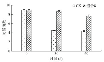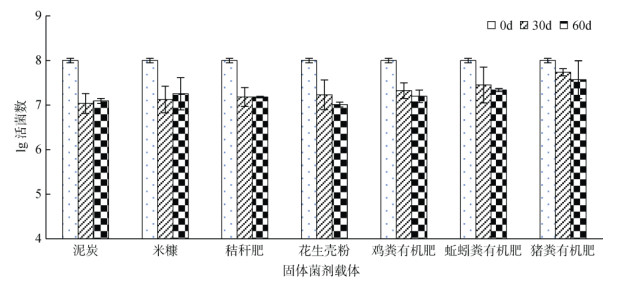 1.6 固体菌剂的保存效果将各固体菌剂常温保存30、60 d,对其分别进行稀释涂布,30 ℃培养3 d后测定活菌数。