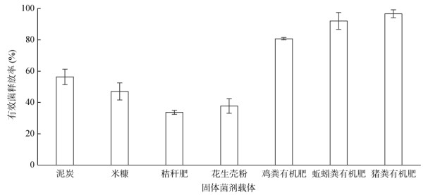 固体菌剂中微生物的释放率决定了菌剂能否最大化地发挥效用,是除活菌数之外衡量固体菌剂质量的重要指标。如图 4,猪粪有机肥载体的有效菌释放率最高,为96.67%,秸秆肥的有效菌释放率最低,仅为33.70%。猪粪有机肥作为载体不仅活菌数最高,其释放率也最好,认为可作为固体菌剂载体的最佳候选。可以看出,同一菌种在不同载体中的释放量存在明显差异,释放量过低可能是由于载体内部微孔结构中可利用的有效营养物质太少而导致微生物无法生存。