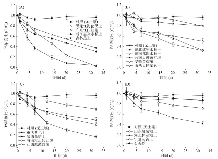 1) 不同类型土壤中PS分解速率存在显著差异,其中有机质含量较高的土壤对PS的分解要明显快于有机质含量低的土壤,在土壤中PS半衰期会缩短一半以上。土壤有机质和无定形锰的含量是PS分解的主要影响因素。但是由于土壤组成和成分的复杂性,PS的分解与不同类型的Fe含量之间的相关性不显著,与砂粒含量之间的相关性相对显著。