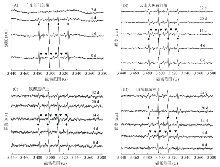 在有机质含量较高的广东江门红壤体系中,反应初期在体系中测到了较高的自由基信号,说明了反应初期PS的分解产生了较高浓度的自由基。但随着反应的进行,自由基信号强度有明显降低,在反应第7天检测到了一个由金属锰离子溶出而引起的宽峰。锰离子作为一种PS的活化剂,可以在反应中加速PS的分解[15]。在云南大理黄红壤和陕西黑垆土体系中,同样也可在反应32 d观察到·OH信号的减弱。而在有机质含量较低的山东聊城潮土体系中,反应32 d自由基信号没有明显降低,说明PS在低有机质含量的土壤中分解较少,自由基产生量也较少。以上结果说明了PS的分解有诱导自由基的产生,且有机质含量较高的土壤中,由于PS分解较快而在反应初期就能形成较高浓度的自由基,但随着PS浓度的降低自由基的浓度也随着降低;在低有机质的土壤中,尽管PS分解速率较慢导致自由基的浓度低,但自由基会在整个反应过程持续更长的时间。