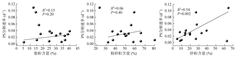 土壤颗粒是构成土壤固相的物质,其组成和含量会直接影响土壤的性质,而土壤性质的不同影响着氧化剂的分解[32]。根据土壤颗粒的大小,将其分为黏粒(< 0.002 mm)、粉砂粒(0.05~0.002 mm)和砂粒(2~0.05 mm)3部分,不同部分的含量与PS分解Kobs之间的相关性如图 7所示。由图 7可知,只有砂粒含量与Kobs之间具有一定的相关性(R2=0.54,P < 0.05),黏粒和粉砂粒含量与Kobs之间的相关性不显著。已有研究报道,土壤颗粒中黏粒含量与有机质含量呈正相关关系,但是这部分有机质与土壤黏粒往往结合紧密难以分解[33]。而砂粒易与土壤中较细颗粒结合形成更大的稳定性较差的土壤团聚体[34],且有研究表明与粗砂粒相结合的有机质分解要快于与细黏粒相结合的有机质[35-36]。故在本试验中,振荡反应使得与砂粒-有机质团聚体分散开来,释放出来的有机质与PS快速反应,引起PS的分解。