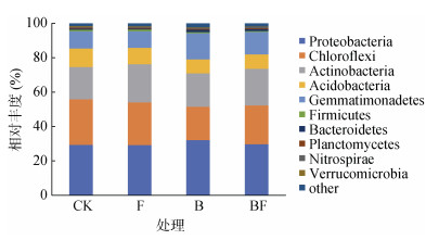 图 2 基于RDP分析下不同施肥处理细菌门水平的菌群分布 Fig. 2 RDP analysis of bacterial flora at phyla level under different fertilization treatments |