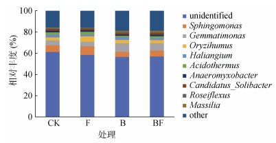 如图 3所示,使用RDP分类器对序列进行属水平分类,结果显示,除了一个未确认的属外,处理中的土壤细菌被分为9个属和一个其他属。相对丰度较高的属是鞘氨醇单胞菌属(Sphingomonas,占比4.79% ~ 8.15%)、芽单胞菌属(Gemmatimonas,4.30% ~ 8.11%)、稻田土壤菌属(Oryzihumus,2.76% ~ 6.65%)、赭黄嗜盐囊菌属(Haliangium,1.08% ~ 2.60%)和酸性嗜热菌属(Acidothermus,1.31% ~ 2.53%)。烟秆生物质炭施用使得土壤芽单胞菌属水平和稻田土壤菌属水平相比CK分别提高了1.76倍和1.11倍;烟秆生物质炭与化肥配施后,与单施化肥处理相比,土壤芽单胞菌属、赭黄嗜盐囊菌属、玫瑰弯菌属(Roseiflexus)、马赛菌属(Massilia)提升效果较为明显,其中马赛菌属比单施化肥处理提高了339.25%;与单施烟秆生物质炭处理相比,土壤鞘氨醇单胞菌属、酸性嗜热菌属、厌氧粘杆菌属(Anaeromyxobacter)、马赛菌属分别提高了17.91%、19.32%、16.84%、32.09%,而芽单胞菌属、稻田土壤菌属、淡赭黄嗜盐囊菌属、玫瑰弯菌属则降低了13.85%、6.16%、22.00% 和37.09%。