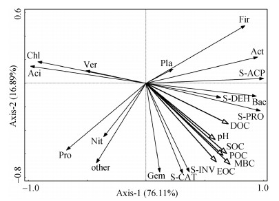 图 4为冗余分析(RDA),空心箭头代表土壤pH及土壤有机碳组分含量,箭头长短可以代表影响因子对于细菌种群分布的影响程度的大小,可见土壤SOC、EOC、POC、MBC是影响土壤有机质分解和参与碳循环的细菌分布的主要参数,而土壤pH、DOC的影响较小。实心箭头代表土壤5种酶活性和细菌在门分类水平上10种优势物种土壤优势细菌群落的相对丰度,影响因子与细菌种群箭头间的夹角代表正、负相关性,夹角越小(< 90°)则表示两者正相关越显著,反之(> 90°)则负相关越显著。由图 4可以看出,土壤pH、SOC、DOC、POC、EOC、MBC含量与土壤各种酶活性呈显著正相关关系(P < 0.05),与放线菌门、厚壁菌门、拟杆菌门、浮霉状菌门呈显著正相关,与绿弯菌门、酸杆菌门、疣微菌门呈显著负相关。土壤DOC含量与变形菌门、硝化螺旋菌门呈显著负相关关系。