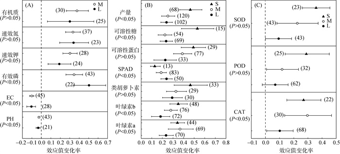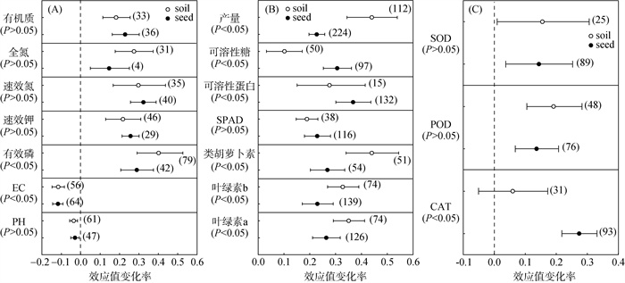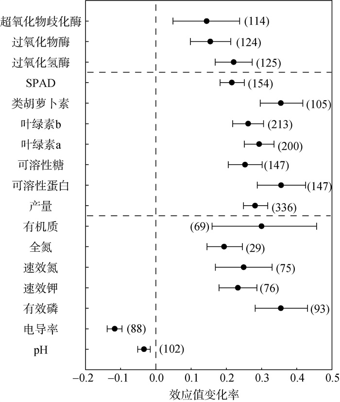 (误差条表示95% 的置信区间,括号内数值代表样本数,下图同) 图 1 各指标对盐胁迫下接种PGPR的综合响应 Fig. 1 Comprehensive responses of indicators to PGPR application in saline-alkali land |