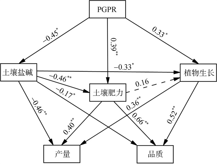 通过构建SEM揭示了接种PGPR对盐碱地作物产量与品质的调控路径,优化后的适配模型如图 5所示,模型适配参数