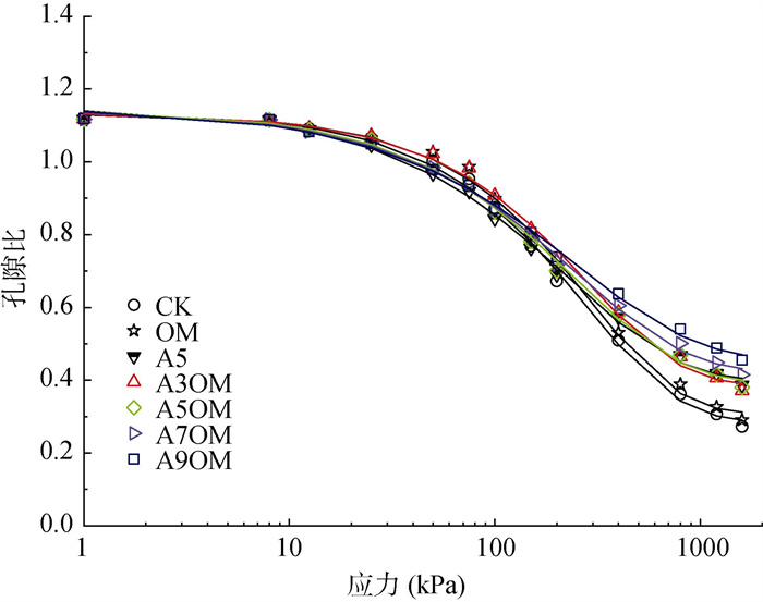 将风干土、粉碎的玉米秸秆和腐熟牛粪过2 mm筛备用。以当地将铁矿尾砂应用于农业生产为依据,设铁矿尾砂添加量200、340、480和620 g/kg土4个水平,分别记作A3、A5、A7和A9;以赵玉皓等[12]对褐土长期定位试验为参考,有机物料玉米秸秆和腐熟牛粪施用量分别设定为1.125×104 kg/hm2和4.5×104 kg/hm2,记作OM,试验共设7个处理,具体为:对照处理(CK)、单施有机物料处理(OM)、单施铁矿尾砂处理(A5)、200 g/kg铁矿尾砂配施有机物料处理(A3OM)、340 g/kg铁矿尾砂配有机物料处理(A5OM)、480 g/kg铁矿尾砂配施有机物料处理(A7OM)、620 g/kg铁矿尾砂配施有机物料处理(A9OM)。按2.25×106 kg/hm2土壤质量换算每公斤褐土添加有机物料和铁矿尾砂质量,用元素分析仪Vario ELⅢ和激光粒度仪Mastersizer 3000分别测得各处理有机质和砂粒含量[13],不同处理各材料添加量及其有机质和砂粒含量如表 2所示。将混合样品平铺于塑料盆中并喷洒去离子水,使其含水率为18%,密封置于25 ℃恒温箱中平衡一昼夜,使水分均匀分布。按1.25 g/cm3容重装入土工试验专用环刀(φ=6.18 cm,h=2.00 cm)进行固结试验,每个处理重复3次。