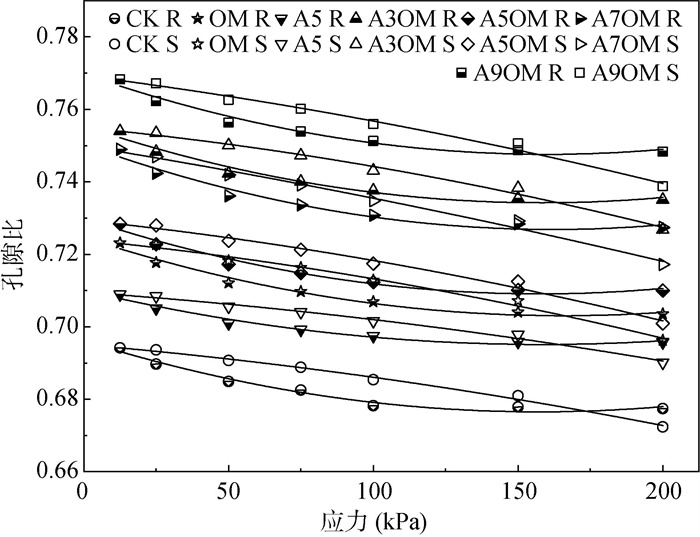 (图例中R、S分别表示回弹、再压缩过程) 图 2 不同处理下褐土供试土样回弹–再压缩曲线 Fig. 2 Rebound and recompression curves of cinnamon soils under different treatments |