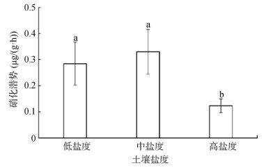 从图 2中可以看出,高盐度土壤硝化潜势平均为0.12 μg/(g·h),与低盐度(0.28 μg/(g·h))和中盐度(0.33 μg/(g·h))相比显著降低(P < 0.01),说明高盐度显著抑制了土壤的硝化潜势。