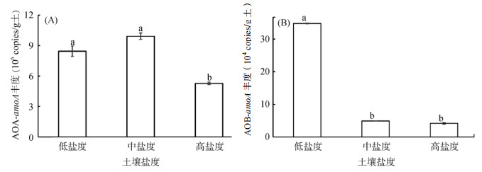 AOB-amoA基因丰度在盐度梯度间存在极显著性差异(P < 0.01,图 3B),其中低盐度土壤AOB-amoA基因丰度为3.48×105 copies/g土,显著高于中盐度土壤(4.90×104 copies/g土)和高盐度土壤(4.16×104 copies/g土)。