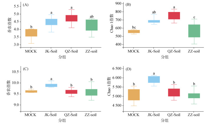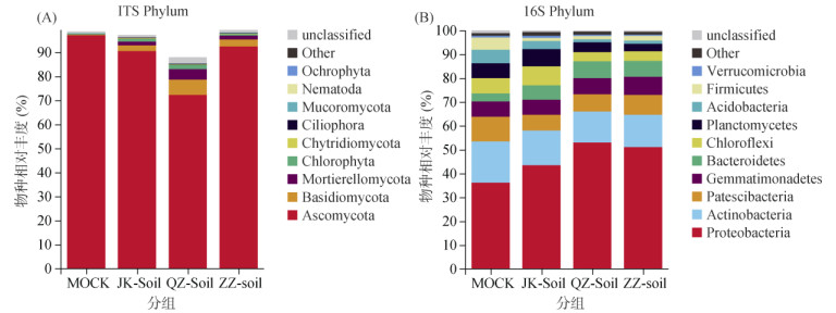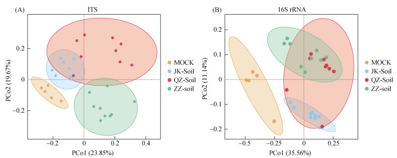 为了更直观地展现组间差异,采用PCoA方法基于Bray-Curtis distance进行β多样性分析。结果表明(图 2),Mock、JK-soil、QZ-soil和ZZ-soil的真菌群落显著聚类区分(ANOSIM,R=0.504,P=0.001),细菌群落也显著聚类区分(ANOSIM,R=0.523,P=0.001),但是QZ-soil与JK-soil、ZZ-soil存在部分重叠。