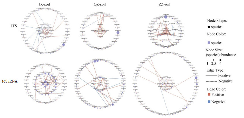在比较Mock、JK-soil、QZ-soil和ZZ-soil之间的群落多样性、物种丰度、群落组成等后,进一步对物种之间的相关性进行网络分析(图 4)。结果显示,JK-soil的细菌物种相关性网络复杂程度高于ZZ-soil,JK-soil的细菌物种之间联系更为紧密,表现出更多的正共生关系。然而,真菌物种相关性网络复杂程度的结果相反,ZZ-soil的真菌物种相关性网络复杂程度高于JK-soil,ZZ-soil物种之间联系更为紧密,表现出更多的正共生关系。QZ-soil的真菌、细菌网络复杂度和正共生关系数量均处于JK-soil和ZZ-soil之间。