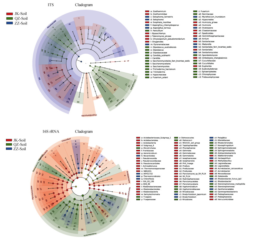 2.6 特征性物种分析根际微生物群落结构解析后,为了更深地理解不同健康程度植株的根际微生物组特征,进一步探究了其根际的关键驱动菌群,发现JK-soil微生物群落中有更多的特有真菌OTUs(JK-soil 165个,QZ-soil 163个,ZZ-soil 104个),同时JK-soil也具有更多的特有细菌OTUs(JK-soil 687个,QZ-soil 251个,ZZ-soil 403个)。进一步通过LEfSe法对JK-soil、QZ-soil、ZZ-soil进行比较,选取LDA值> 3的绘制进化分支图,展示组间差异显著的特征物种及其进化关系(图 5)。细菌类别中,在属(Genus)水平上,JK-soil的特征性物种有气微菌属(Aeromicrobium sp.)、小梨形菌属(Pirellula sp.)、诺卡氏菌(Pir4 lineage sp.)、甲基芽胞杆菌属(Methylobacillus sp.)、Rubinisphaeraceae sp.、假诺卡氏菌属(Pseudonocardia sp.)、不动杆菌(Acinetobacter sp.)、放线异壁酸菌属(Actinoallomurus sp.)、出芽菌属(Gemmata sp.);QZ-soil的特征物种有独岛氏菌属(Dokdonella sp.)、窄食单胞菌属(Stenotrophomonas sp.)、生丝微菌(Hyphomicrobium sp.)、特吕珀菌属(Truepera sp.)、新鞘氨醇杆菌(Novosphingobium sp.)等;ZZ-soil有罗思河小杆菌属(Rhodanobacter sp.)、类诺卡氏菌(Nocardioides sp.)、草螺菌属(Herbaspirillum sp.)、Pelagibius sp.和慢生根瘤菌(Bradyrhizobium sp.)等。在种(Species)水平上,JK-soil种水平上的特征性细菌有浮霉菌(Planctomyces sp.)、醋酸钙不动杆菌(A. calcoaceticus)等,QZ-soil有嗜麦芽窄食单胞菌(S. maltophilia),ZZ-soil有富尔维红杆菌(R. fulvus)、大豆慢生型根瘤菌(B. japonicum)。