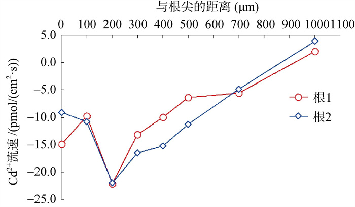(流速数值为负值表示吸收,正值表示外排;下同) 图 1 伴矿景天根尖不同距离处Cd2+流速变化 Fig. 1 Cd2+ fluxes across root surface at different distances from root tips of Sedum plumbizincicola |