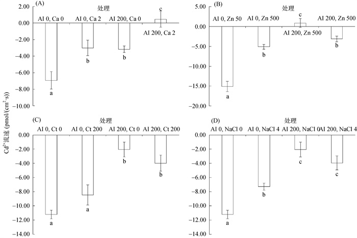 (图中误差线为标准误,n = 8。Al 200表示200 μmol/L AlCl3;Ca2表示2 mmol/L CaCl2;Zn50表示50 μmol/L ZnCl2;Zn500表示500 μmol/L ZnCl2;Ct200表示200 μmol/L柠檬酸;NaCl4表示4 mmol/L NaCl。不同的小写字母表示不同处理间差异在P < 0.05水平显著;下同) 图 2 短期水培试验下添加不同试剂伴矿景天根尖Cd2+的流速 Fig. 2 Cd2+ fluxes across root surface after addition of different chemical reagents in short-term hydroponic experiment |