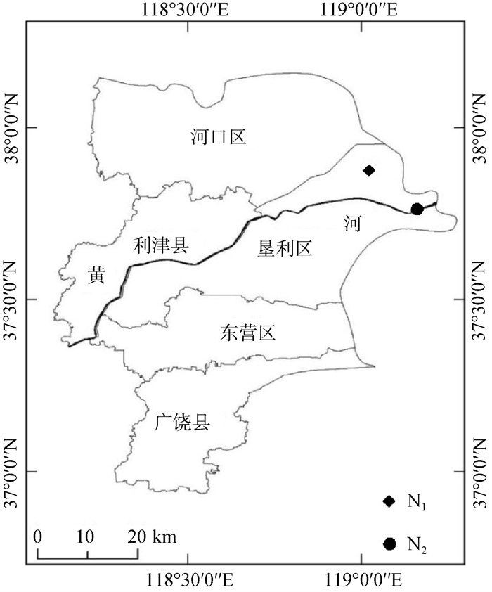 1 材料与方法 1.1 研究区概况黄河三角洲地区属暖温带季风气候半湿润区,雨热同期。当地多年平均气温13℃,多年平均降水量560 mm,65% 分布在夏季;年均蒸散量750 ~ 2 400 mm,蒸降比约4∶1。在黄河三角洲天然柽柳分布区选取2处试验样地,分别位于孤东油田(37.88°N,119.02°E,简称N1)与黄河三角洲自然保护区(37.76°N,119.16°E,简称N2)(图 1)。