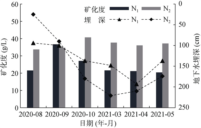 图 2 两地地下水埋深及矿化度的时间动态变化 Fig. 2 Temporal dynamic variation of groundwater table depth and salinity at two sites |
