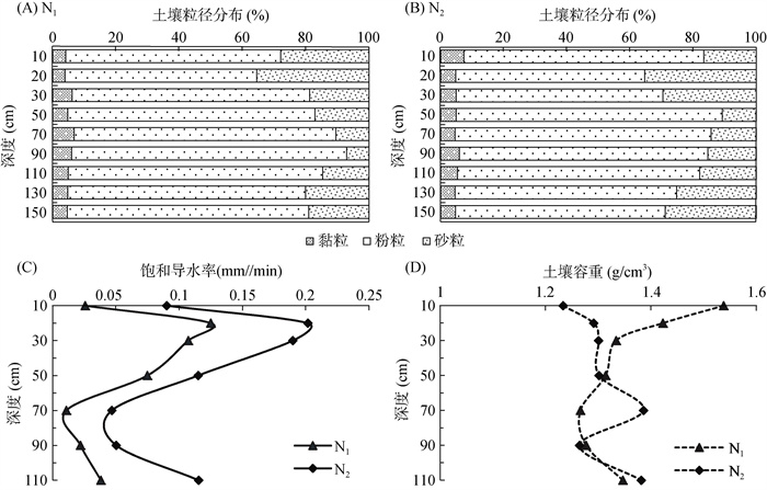 为获得N1、N2两地的基础土壤物理性质,用环刀法测定不同深度土壤容重,用激光粒度仪(Mastersize 3000)法测定土壤粒径分布,用环刀定水头法测得饱和导水率。