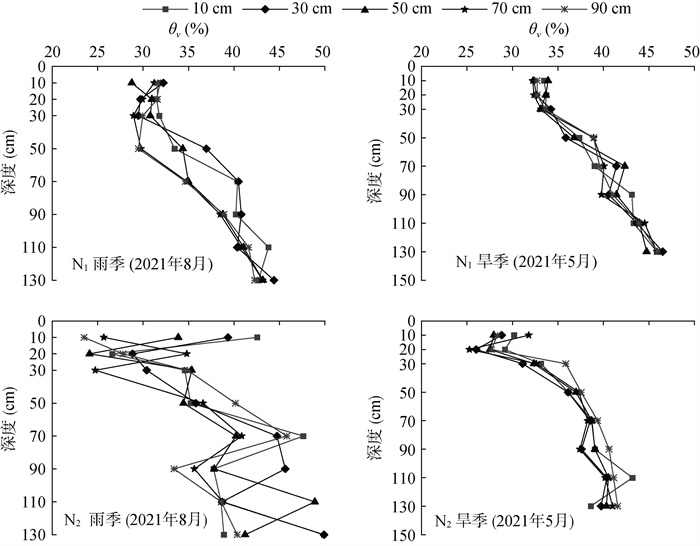 2.1 柽柳样地土壤水分时空变化特征两地土壤体积含水率(θV)变化如图 4所示,一方面,两地含水率整体均随土壤深度增加而增大,N1、N2样地含水率分别在25% ~ 45%、20% ~ 50% 范围内波动,其中N2样地的波动范围更大。在雨季,距柽柳植株水平距离为10 cm和30 cm的内围区土壤剖面θV较大,50 ~ 90 cm水平距离的外围区土壤剖面θV相对较小,而且N2样地含水率较N1样地高,随水平距离的变化幅度更明显。旱季两地土壤剖面θV随距柽柳植株水平距离的变化较雨季更小,其中N2样地θV整体低于N1样地,且0 ~ 20 cm土层θV呈快速递减趋势。