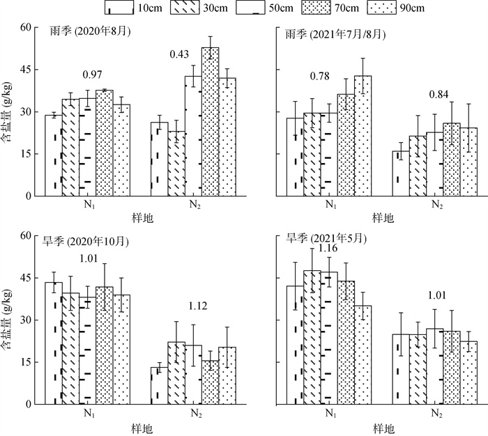 (图例为距柽柳植株的水平距离;柱图上方中数字为盐分富集率E;由于2021年6月,N2样地被淹,无法采样,N1样地完好,故当年两处样地雨季采样时间不一致,2021年7月为N1样地采样时间,代表雨季;2021年8月为N2样地采样时间,代表雨季) 图 5 不同季节两地土壤盐分变化特征 Fig. 5 Variation characteristics of soil salinity at two sites in different seasons |