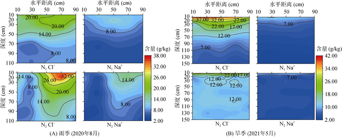 雨季时,两地土壤Cl–、Na+含量及其分布格局如图 6A所示,N1样地土壤Cl–含量(6.75 ~ 23.50 g/kg)低于N2样地(6.60 ~ 35.40 g/kg),两地Na+含量较接近,分别为3.80 ~ 12.32、3.80 ~ 16.45 g/kg。在分布格局上,两地土壤Cl–、Na+含量均随土壤深度增加而递减,且Cl–变化更突出。此外,N2样地内围区土壤Cl–、Na+含量整体低于外围区,呈“左–右”空间分异,而N1样地土壤Cl–、Na+呈现“上–下”空间分异,这说明N2样地土壤Cl–、Na+在雨季发生的淋洗作用比较强烈,与图 5中雨季N2样地盐分富集率更低(E = 0.43),“盐谷”效应更强相对应。由图 6B可知,旱季两地土壤Cl–、Na+含量及其分布格局较雨季存在差异。在含量上,N1样地土壤Cl–高于N2样地,分别为4.20 ~ 41.70、9.00 ~ 28.80 g/kg;Na+含量仍较接近,分别为2.10 ~ 12.60、3.60 ~ 11.40 g/kg。同时,两地土壤Cl–含量及其差值仍均高于Na+。在分布上,两地土壤Cl–、Na+含量随土壤深度增加而递减,且均呈“上–下”空间分异,但两处样地也有所不同。N1样地土壤Cl–含量更高,在0 ~ 50 cm深度范围内有剧烈变化,N2样地土壤Cl–更集中分布在0 ~ 20 cm深度范围内,说明N2样地土壤盐分表聚更显著,这是由于N2样地土壤表面未形成盐结皮,旱季蒸发旺盛,水盐运动剧烈所导致的。