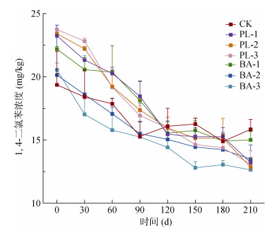 2 结果 2.1 土壤中1,4-二氯苯的降解动力学为探究外源添加降解基因对土壤中有机氯农药降解效率影响,本研究分别测定了为期210 d中1,4-二氯苯的降解动力学(图 1)。在对照组CK中,1,4-二氯苯消减过程最缓慢,降解率为18.59%;外源添加降解基因DNA片段处理组中(PL-1, PL-2, PL-3),有机氯农药降解率为32.35% ~ 38.43%,是对照组降解率的1.74倍~ 2.07倍;外源添加携带降解基因菌群处理组中(BA-1, BA-2, BA-3),1,4-二氯苯降解率最高,为43.10% ~ 44.74%,是对照组降解率的2.32倍~ 2.41倍。该结果说明,外源添加含降解基因菌群或DNA片段会加速1,4-二氯苯降解,且外源添加携带降解基因菌群处理组中,有机氯农药降解最快。