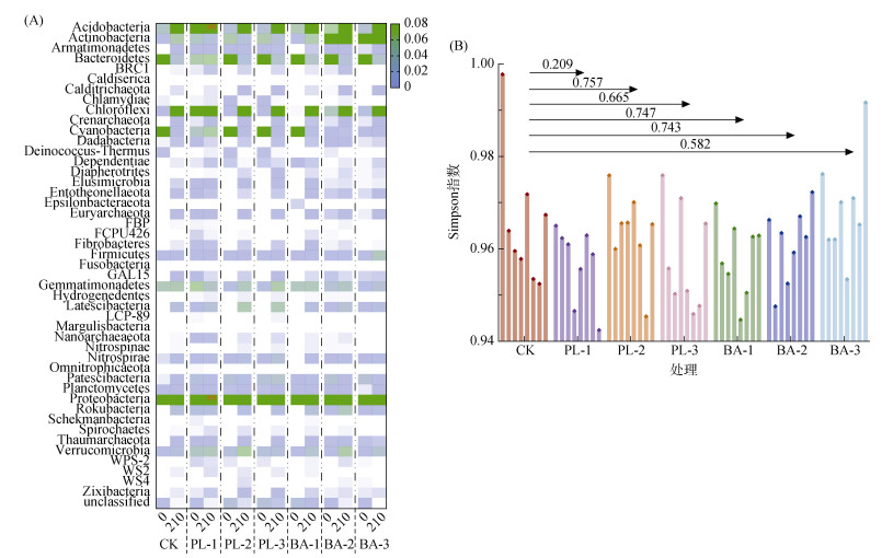 (A. 外源添加含降解基因菌群及质粒DNA后,在门水平上,第0天(0)和第210天(210)土壤中菌群相对丰度变化,其中,**标记为210 d后土壤菌群相对丰度显著上升;B. 各样本210 d内菌群Simpson指数变化柱状图,不同颜色代表不同处理组,且箭头上方的数字代表各处理组与对照组之间的Pearson系数) 图 2 土著菌群组成与多样性动态变化 Fig. 2 Variations of composition and diversity of soil indigenous flora |