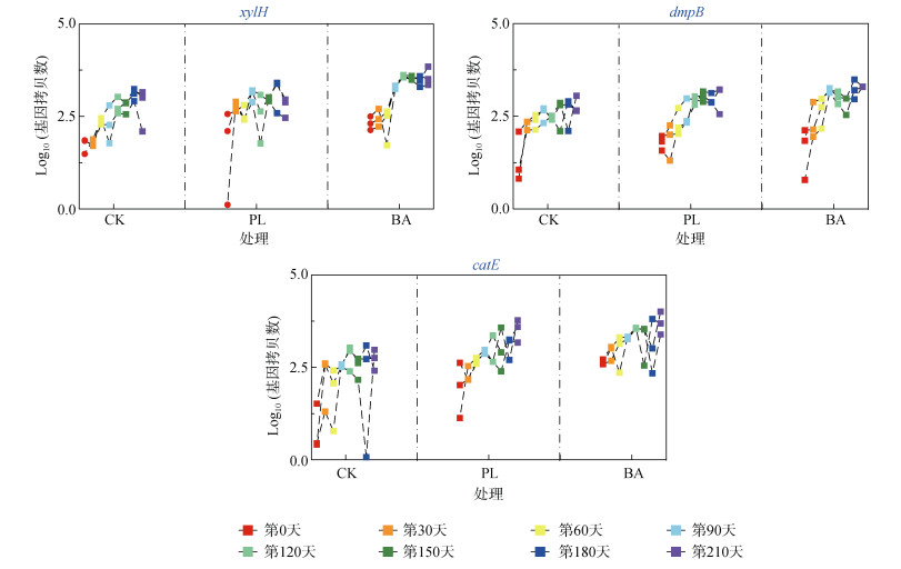 关注土壤中降解基因动态变化也有助于洞悉外源添加降解基因对于土著菌群降解功能的潜在影响。本研究对所有处理组中降解基因210 d内动态变化进行了定量,其中,xylH、dmpB和catE 3种降解基因都能专属作用于苯环类物质降解,尤其是氯苯物质降解。在对照组中,与第0天相比,在第210天时这3种降解基因都有显著上调,xylH、dmpB和catE分别增长了59.48%、67.54% 和51.53%;在外源添加降解基因DNA片段处理中,第210天相对于第0天时,xylH、dmpB和catE分别增长了73.55%、108.13% 和82.66%;而在外源添加含降解基因菌群处理中,相对于第0天时,3种基因在第210天时分别增长了171.66%、110.76% 和126.46%(P < 0.05)。同时,在外源添加降解基因处理中,降解基因增长率比对照组上升了1.24 ~ 1.60个数量级;外源添加降解菌群处理组中,降解基因增长率则比对照组上升了1.64 ~ 2.89个数量级。该结果说明,外源添加降解基因或降解菌群之后,土著菌群中潜在降解基因含量均显著上升,特别是添加含降解基因的菌群效果更显著(P < 0.05)。