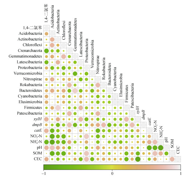 2.6 土壤性质、关键菌群与降解基因的交互作用为了深入分析土壤菌群降解活性的影响因素,选择有机氯农药、土壤理化性质、关键菌群及降解基因分析它们之间相互作用关系(图 6)。其中,1,4-二氯苯降解率除与Crenarchaeota、Latescibacteria等关键物种之间呈显著负相关关系外,与Proteobacteria、Bacteroidetes、Acidobacteria、Elusimicrobia和Cyanobacteria等细菌门之间都呈显著正相关关系,与3种降解基因拷贝数也呈显著正相关关系;在土壤环境因子中,土壤NO3–-N和NH4+-N都与农药降解率之间呈负相关关系,土壤pH、有机质含量和CEC等都与1,4-二氯苯的降解率呈显著正相关关系。该结果说明,在外源添加降解基因DNA片段或菌群处理中,土著菌群降解1,4-二氯苯能力与土壤关键菌群增长和降解基因增长显著正相关。