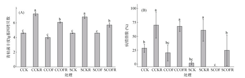 2 结果 2.1 不同处理下土壤化学性质的变化不同处理下土壤化学性质有所不同,如表 3所示,土壤中的有机碳、速效氮、有效磷和速效钾的含量依次为SCOF > SCOFR > CCOF > CCOFR > SCK > CCK > CCKR。与CCK处理相比,SCK处理的速效氮和有效磷含量明显提升,分别增加了25.77% 与20.49%,而进行有机无机配施处理(CCOF)后,有机碳、速效氮、有效磷、速效钾的含量分别增加了37.27%、1.24倍、1.83倍与1.51倍。整体来看,不论是在感病土中还是在抑病土中,有机无机配施均可提高土壤中有机碳、速效氮、有效磷、速效钾含量,而pH则有所下降(P < 0.05)。此外,接种病原菌与不接种病原菌对土壤的理化性质均无显著影响(P > 0.05)。