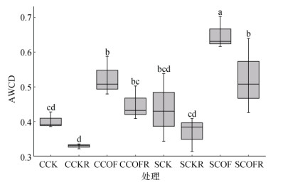 不同处理下番茄根际土壤微生物的代谢活性不同,如图 3所示。SCOF处理的根际土壤微生物活性最高,其次是CCOF、SCOFR、CCOFR处理,分别是CCKR处理的1.97倍、1.59倍、1.59倍与1.36倍。同样,抑病土中接种与未接种病原菌处理的土壤微生物活性也分别高于感病土中,但仅在SCOF处理中有显著影响(P < 0.05)。不同处理下番茄根际土壤的微生物对不同碳源类型的利用也不同,如表 4所示。不论是感病土还是抑病土,有机无机配施处理下的根际微生物对碳水化合物、多聚化合物和氨基酸类化合物的利用要高于不施肥处理,而羧酸类化合物与酚酸类化合物在接种病原菌处理中被微生物利用明显高于未接种病原菌处理,表现为SCOFR > SCOF,SCKR > SCK,CCOFR > CCOF,CCKR > CCK。