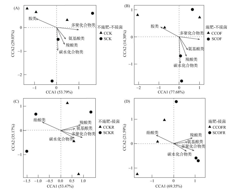 PERMANOVA分析揭示了不同处理对根际土壤微生物代谢功能差异的影响。本研究中有机无机配施处理对根际微生物代谢功能变异的解释度为36.9%,而接种病原菌处理对根际微生物代谢功能的影响程度为26.8%,并且这两个因子解释的根际微生物代谢功能差异均达到了极显著水平(P < 0.01),然而,土壤来源对根际微生物代谢差异的解释度仅为6.5%,且并未达到显著水平(P > 0.05)(表 5)。进一步对土壤微生物的代谢活性与其利用的碳源类型进行典型对应分析(CCA),探究感病土与抑病土中对土壤微生物代谢活性起主要作用的碳源因子,结果显示,在感病土中,不同施肥措施和病原菌接种下的根际土壤微生物功能明显区分,其中,轴一能够明显区分接种与未接种病原菌的土壤微生物功能,对根际微生物代谢功能变异的解释度为63.30%,利用羧酸类、酚酸类和胺类碳源的微生物种群的增多是造成病原菌接种(CCOFR、CCKR)处理下微生物功能群落变异的主要因素,而利用氨基酸类、碳水化合物类、多聚物化合物类的微生物种群与未接种病原菌(CCOF、CCK)处理下微生物代谢功能群落变异最为相关(图 4A)。同样地,在抑病土中也能得到类似的规律,轴一也能够明显区分接种与未接种病原菌的微生物功能群落,对根际微生物代谢功能变异的解释度为53.81%,并且利用羧酸类、酚酸类和胺类碳源的微生物种群的增多也是造成病原菌接种处理(SCOFR、SCKR)的微生物功能变异的主要因素,而利用氨基酸类、碳水化合物类、多聚化合物类的微生物种群的增多是造成未接种病原菌(SCOF、SCK)处理下的微生物功能群落变异的主要因素(图 4B)。类似地,本文探讨了施肥和接种病原菌处理对感病土与抑病土中土壤微生物代谢活性起主要作用的碳源因子,结果表明,不接种病原菌时胺类化合物是造成感病土功能差异的影响因素,而接种病原菌后造成感病土根际微生物代谢功能差异的影响因素是酚酸类化合物,而不论是何处理,造成抑病土根际微生物代谢功能差异的驱动因子是氨基酸类、碳水化合物类、多聚化合物类(图 5)。