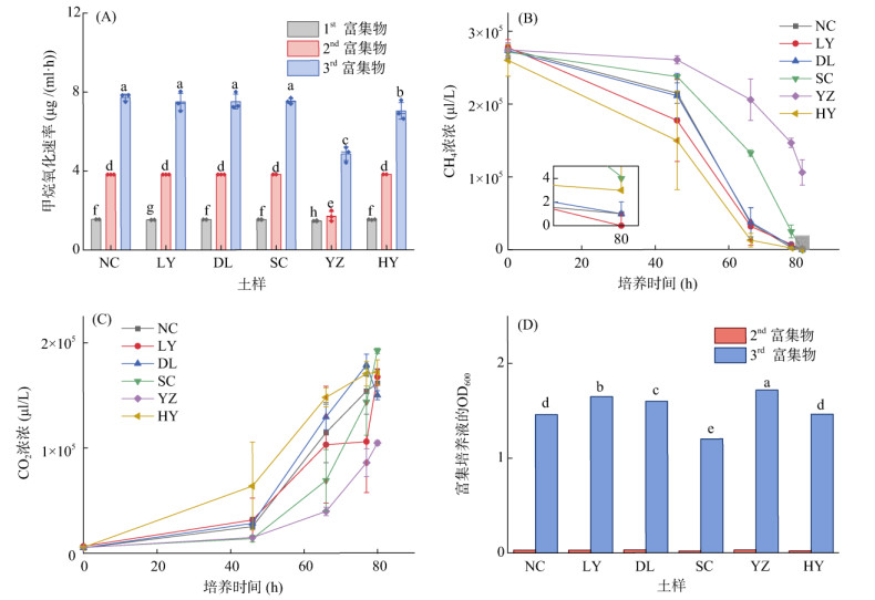 2 结果与分析 2.1 富集培养的甲烷氧化动力学特征经过短暂的复苏及富集培养后,本研究发现6例土壤档案样品均表现出强烈的甲烷氧化活性,根据培养瓶顶空甲烷浓度动态监测结果,得到了甲烷氧化速率及消耗曲线,如图 1A、1B所示。前两代富集液甲烷氧化速率较小,第一代富集液初始甲烷氧化速率仅为1.4 ~ 1.6 μg/(ml·h)(以干土质量计,则为7 ~ 8 μg/(g·h),第二代富集液最高达到了3.8 μg/(ml·h),第三代富集液则达到了4.9 ~ 7.7 μg/(ml·h),与初始速率相比增长了4倍~ 5倍,各样品第三代富集液间甲烷氧化速率存在显著差异,NC土样的甲烷氧化速率最高,达到了7.7 μg/(ml·h),而YZ土样最低,仅为4.9 μg/(ml·h)。值得注意的是,第三代富集液在80 h的培养时间内消耗了几乎全部的甲烷,其中NC、LY、DL、HY这4种土壤富集液在培养结束时瓶内甲烷浓度几乎为0,说明这些富集物不仅可以氧化高浓度甲烷,还具有氧化低浓度大气甲烷的能力。不同样品间CO2释放量及生物积累量也显著不同。其中CO2排放量最低(终浓度104 666 μl/L)的YZ土样却积累了最高的生物量,OD600达到了1.7,而CO2排放量最高(终浓度192 150 μl/L)的SC土样的OD600最低,仅为1.2(图 1C、1D)。结果表明,随着水分和营养的恢复,长期保存的风干土壤样品中的甲烷氧化菌仍可迅速恢复活性并快速生长,甚至还表现出了高亲和力的大气甲烷氧化能力,但不同土样间甲烷氧化菌的复苏能力存在显著差异。