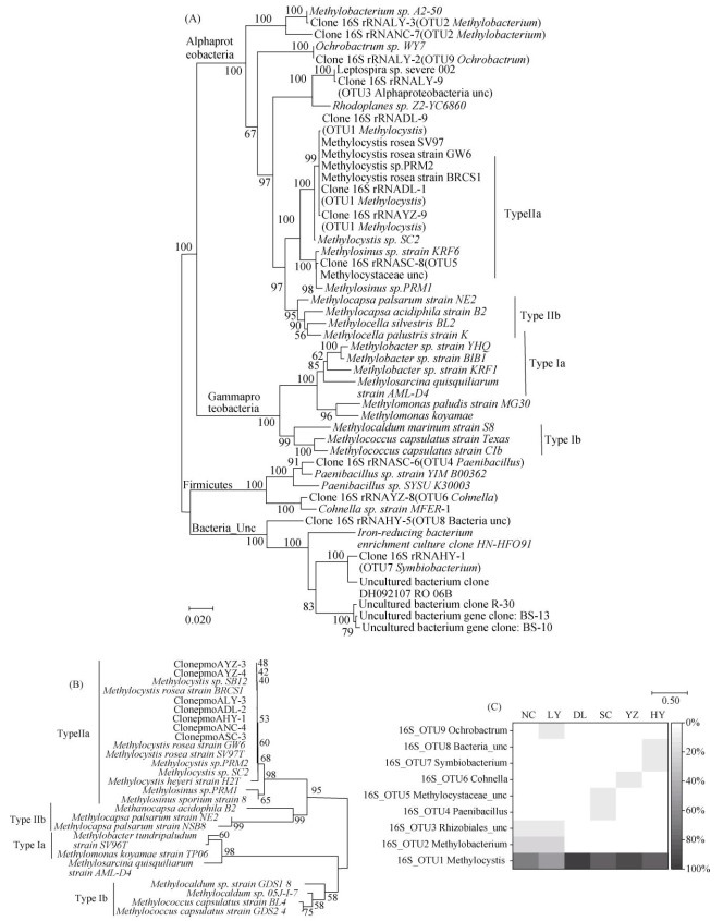 1.5.2 克隆测序数据处理使用mothur(version 1.43.0)软件将得到的克隆序列按前文步骤分析后得到最终的OTU聚类表。按照OTU表挑选代表序列后,上传至NCBI(https://www.ncbi.nlm.nih.gov)网站,使用Blast模块进行核苷酸比对,下载相似物种的核酸序列,使用MEGA7软件绘制甲烷氧化菌代表序列及其近缘物种的系统发育树。