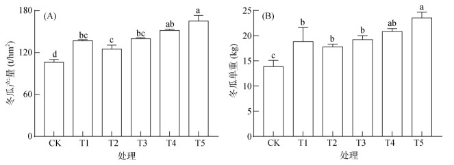 2 结果与分析 2.1 减氮配施中微量肥对冬瓜产量的影响由图 1A看出,T2冬瓜产量比T1降低了8.76%,但差异不显著。配施中微量肥处理的产量均比T1、T2有所提高,其中T4和T5产量比T2分别提高了21.3% 和32.2%;T5比T1产量提高了20.6%,差异显著(P < 0.05)。图 1B显示,配施中微量肥的各个处理冬瓜的单重均高于T1和T2,其中T5的单重提升最多,且产量最高,达到165 t/hm2,配施效果最好。